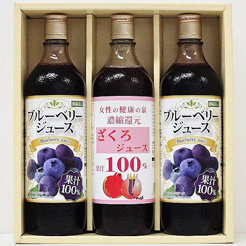 ブルーベリー100%ジュース2本とざくろ100%ジュース1本のセットとなっております。
